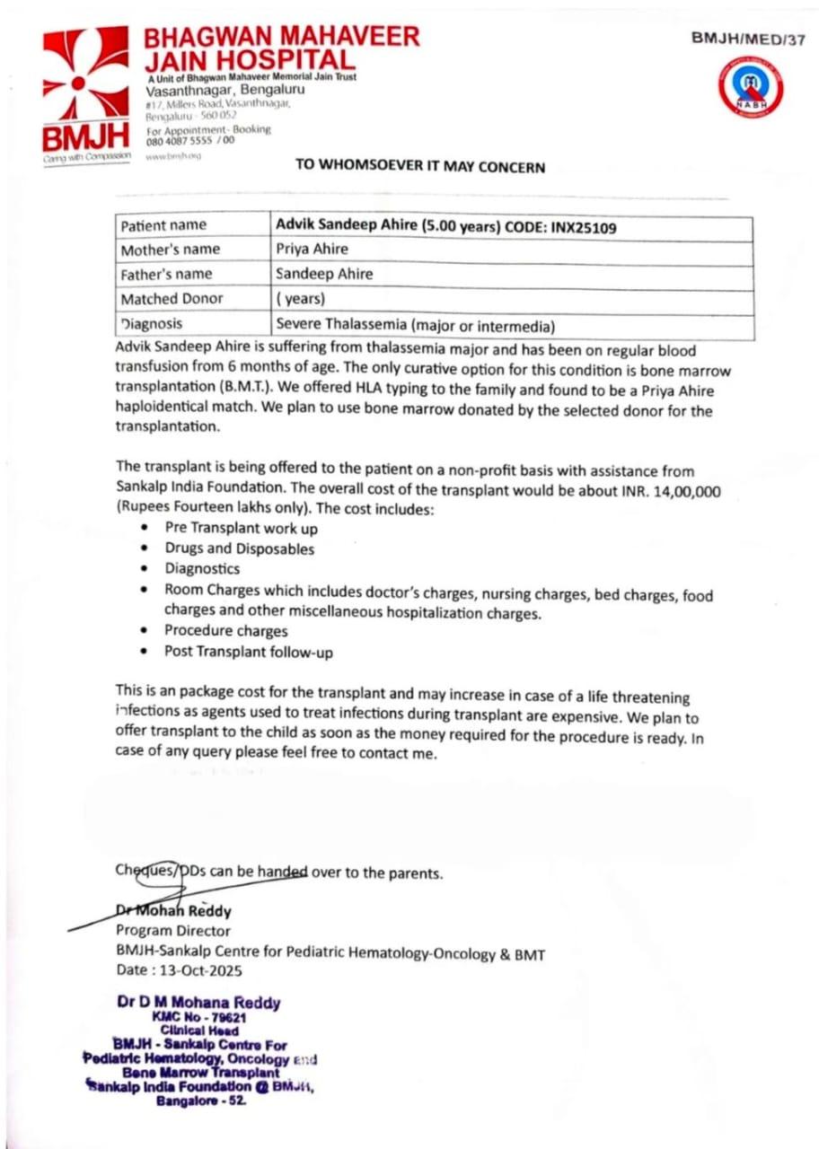 In view of the genuine and critical medical condition, we humbly request you to extend maximum financial help to support Advik’s life-saving Bone Marrow Transplant.