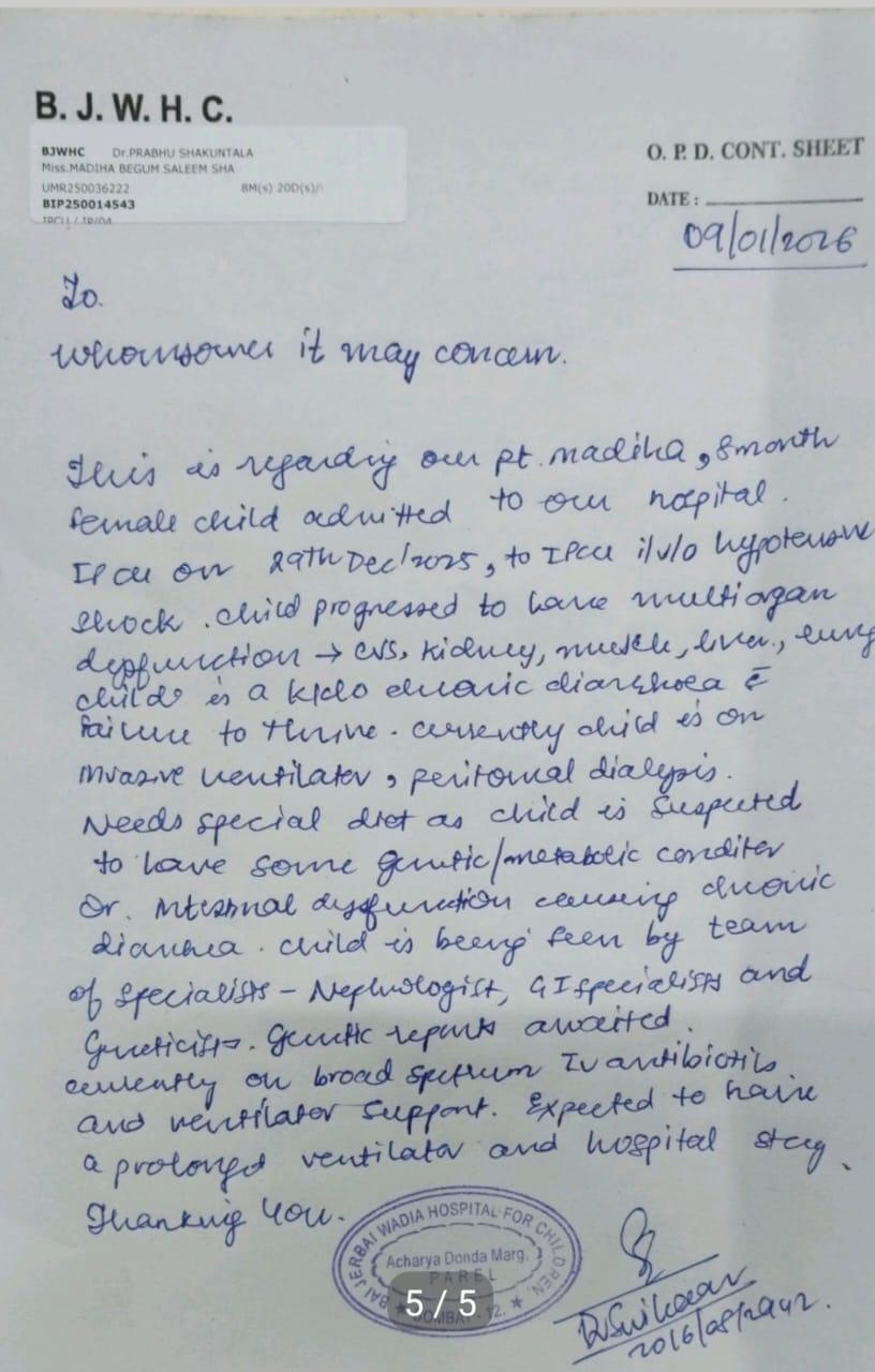 Baby Madiha, an 8-month-old infant girl, is currently admitted at BJWHC Hospital, Mumbai, under the care of Dr. Susihaar. She is critically ill and is receiving treatment in the intensive care unit.