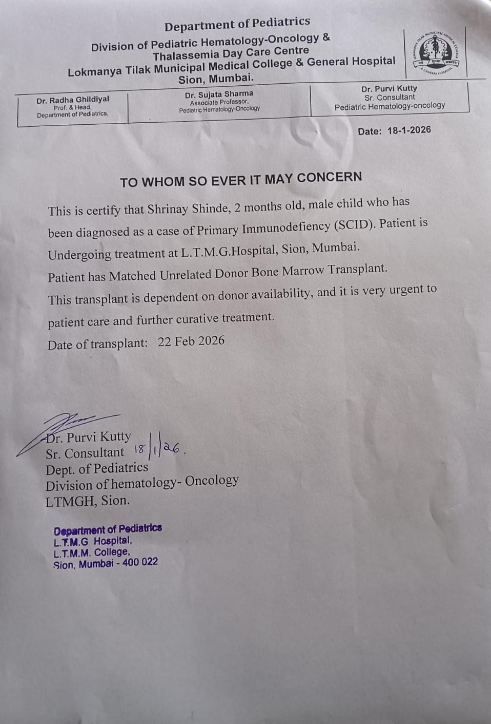 Due to this critical illness, doctors have advised an urgent Bone Marrow Transplant, which is the only curative treatment available. Unfortunately, Baby Shrinay’s condition has been continuously worsening with time, making early intervention absolutely essential.