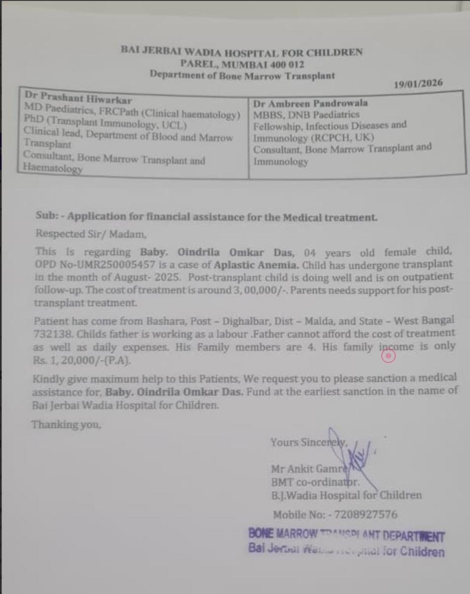 She successfully underwent a Bone Marrow Transplant (BMT) in August 2025 and is currently a post-transplant patient. Thankfully, she is showing improvement and is under regular outpatient follow-up at Bai Jerbai Wadia Hospital, Mumbai.