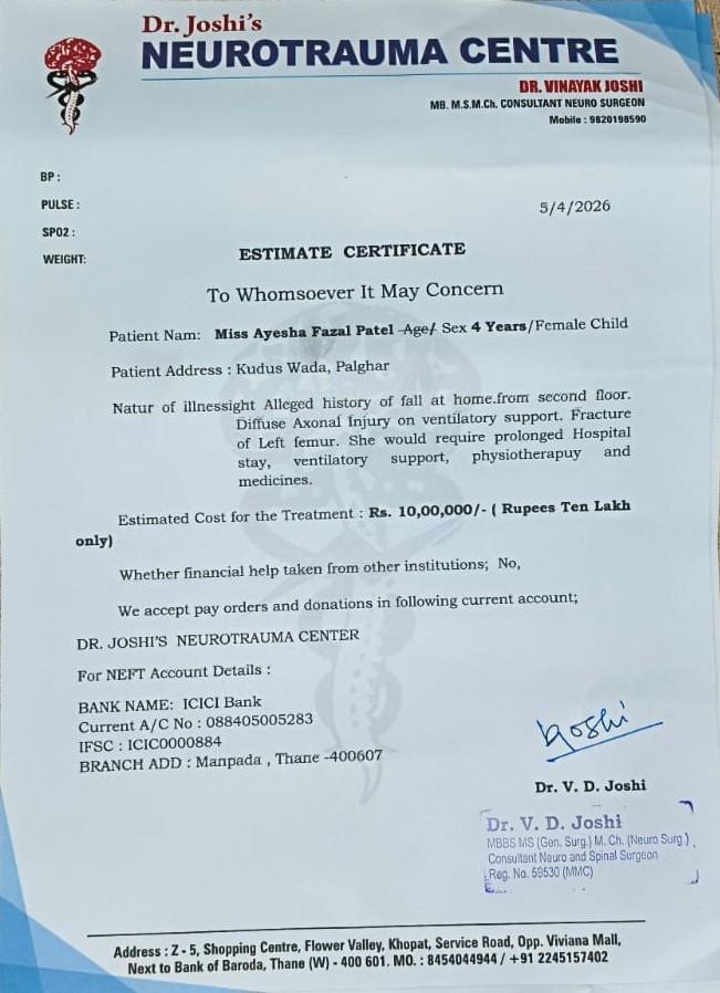 Ayesha is admitted at Dr. Joshi Neurotrauma Centre, where she is receiving intensive medical care. Due to the severity of her injuries, she will require a prolonged hospital stay, continuous ventilator support, intensive care, medications, and long-term physiotherapy for recovery.
