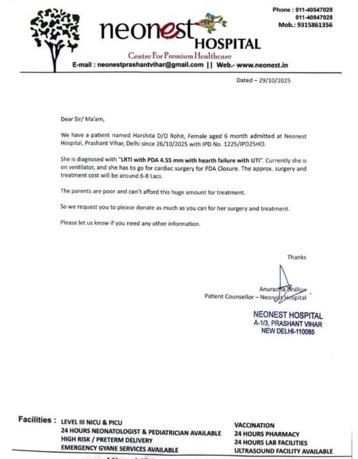 Baby Harshita, a 6-month-old infant, is currently admitted at Neonest Hospital, New Delhi, in a critical and life-threatening condition. She has been diagnosed with: