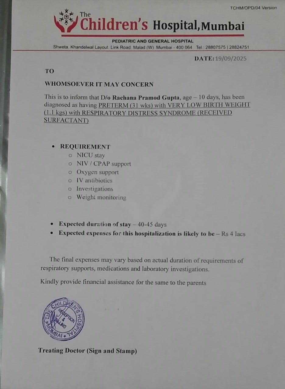 Baby girl was born to Pramod and Rachana Gupta in the Eighth month of her pregnancy. The new born baby girl was underweight (1.1 kg) and have respiratory distress. She is currently in the NICU at The Children’s Hospital Mumbai. Child is on ventilator and high antibiotics, NIV / CPAP support, Weight monitoring and will need long hospital stay. The estimated cost for their treatment is ₹4,00,000.